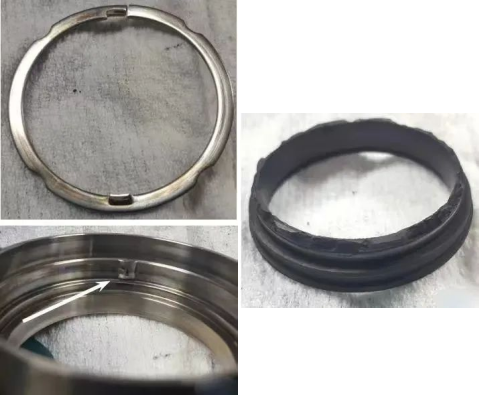 機(jī)械密封過壓會(huì)導(dǎo)致動(dòng)、靜環(huán)密封面外徑處發(fā)生重力觸摸,并向內(nèi)逐漸減小,直至簡(jiǎn)直沒有可見的觸摸。高壓會(huì)導(dǎo)致主密封環(huán)外徑邊際呈現(xiàn)碎裂(缺口)。