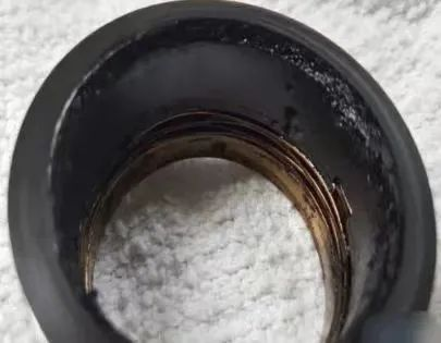結(jié)焦會(huì)在機(jī)械密封的大氣側(cè)留下堆積物或研磨碎屑。當(dāng)密封在過高溫度下運(yùn)轉(zhuǎn)時(shí),會(huì)呈現(xiàn)這種聚積物,但也或許是因?yàn)闆_刷液不潔凈或外部環(huán)境帶來的污染等原因而呈現(xiàn)(見圖4)。