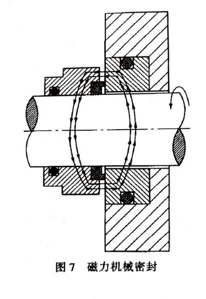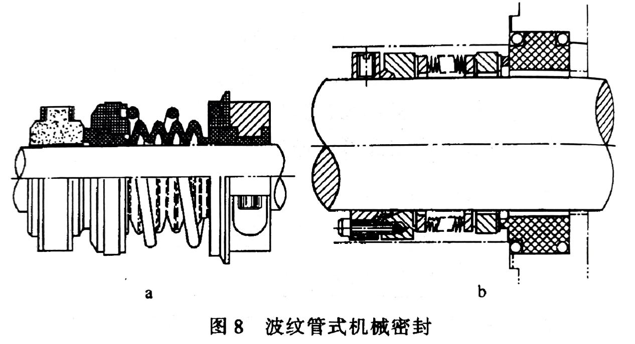補償結(jié)構(gòu)的作用是使密封端面緊密貼合,為達(dá)到此目的,選用的辦法有兩種,一是彈性力,二是磁力。只有在系統(tǒng)內(nèi)壓力較低時采用磁力機械密封(圖7),大多數(shù)都用前者。除了用彈簧形成彈性力外還有用波紋管的,稱為波紋管式機械密封。波紋管的材質(zhì)可用橡膠、聚四氟乙烯(圖8a)和焊接的金屬薄片等(圖8b)。