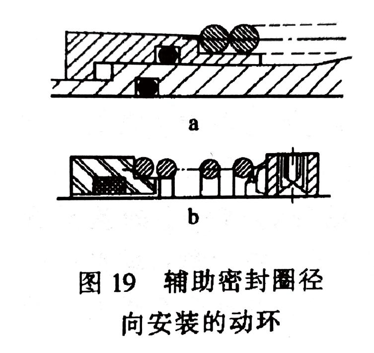輔助密封圈徑向裝置的動環(huán)(圖19),靠密封圈的過盈和彈性實(shí)現(xiàn)密封,其材質(zhì)大多采用聚四氟乙烯和合成橡膠。伴隨使用時(shí)間變長,這兩種材質(zhì)分別呈現(xiàn)冷流變形和老化而失去彈性。有文獻(xiàn)記載,這種結(jié)構(gòu)的密封,有40%的失效發(fā)生在輔助密封圈位置。