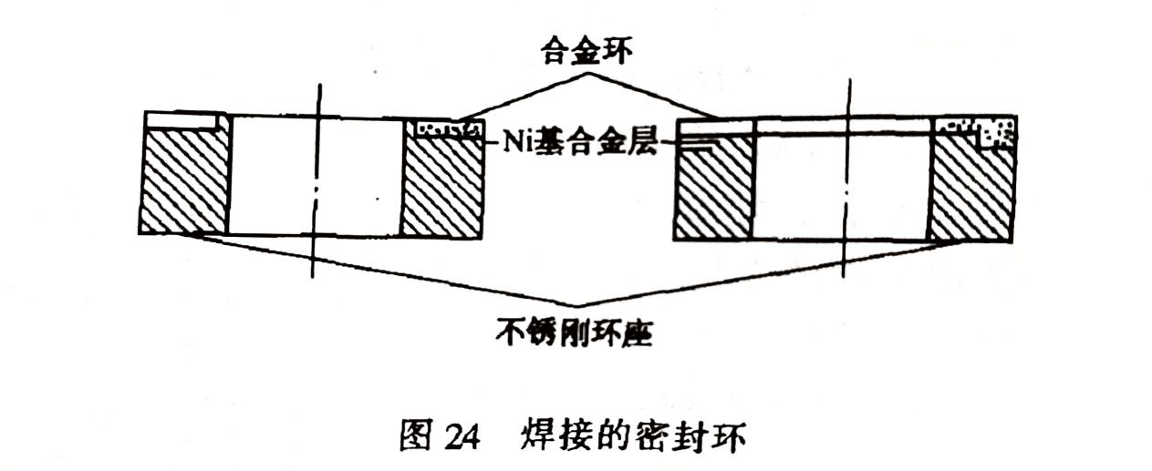 為改善熱裝式密封環(huán)松脫的問題,呈現(xiàn)了焊接的密封環(huán)(圖24)。所用的硬質(zhì)合金是以Cr3C2為硬質(zhì)相、Ni為粘結(jié)相的燒結(jié)合金材料。耐腐蝕優(yōu)于YG6等硬質(zhì)合金,高溫下具有優(yōu)異的抗氧化性能,在1000℃空氣中加熱2小時無任何變化??墒菍?dǎo)熱性能較差,僅為YG6的1/3;線膨脹系數(shù)大,比YG6大1倍多,為10.2x10-6/℃(10~500℃時)。這兩點導(dǎo)致了耐熱沖擊性能不如YG6好。正因為線膨脹系數(shù)較大,和馬氏體不銹鋼接近(10~500℃時為11x10-6/℃),為和環(huán)座焊接提供了有利條件。焊接時需在環(huán)和座之間鋪放一層鎳基粉末,置于真空電阻爐中,經(jīng)1100℃高溫熔焊,然后進(jìn)行回火處理,以消除焊接應(yīng)力。由于是焊接的密封環(huán),硬質(zhì)合金環(huán)的厚度可以比YG6薄,毛坯的厚度也只要3~3.5mm。又因密度小,是YG6的一半(7~7.5g/cm3),因此,可節(jié)約貴重金屬,價格較低。這種合金的牌號為CN15,其間Cr3C2 85%、Ni 15%,由北京硬質(zhì)合金廠研制成功。