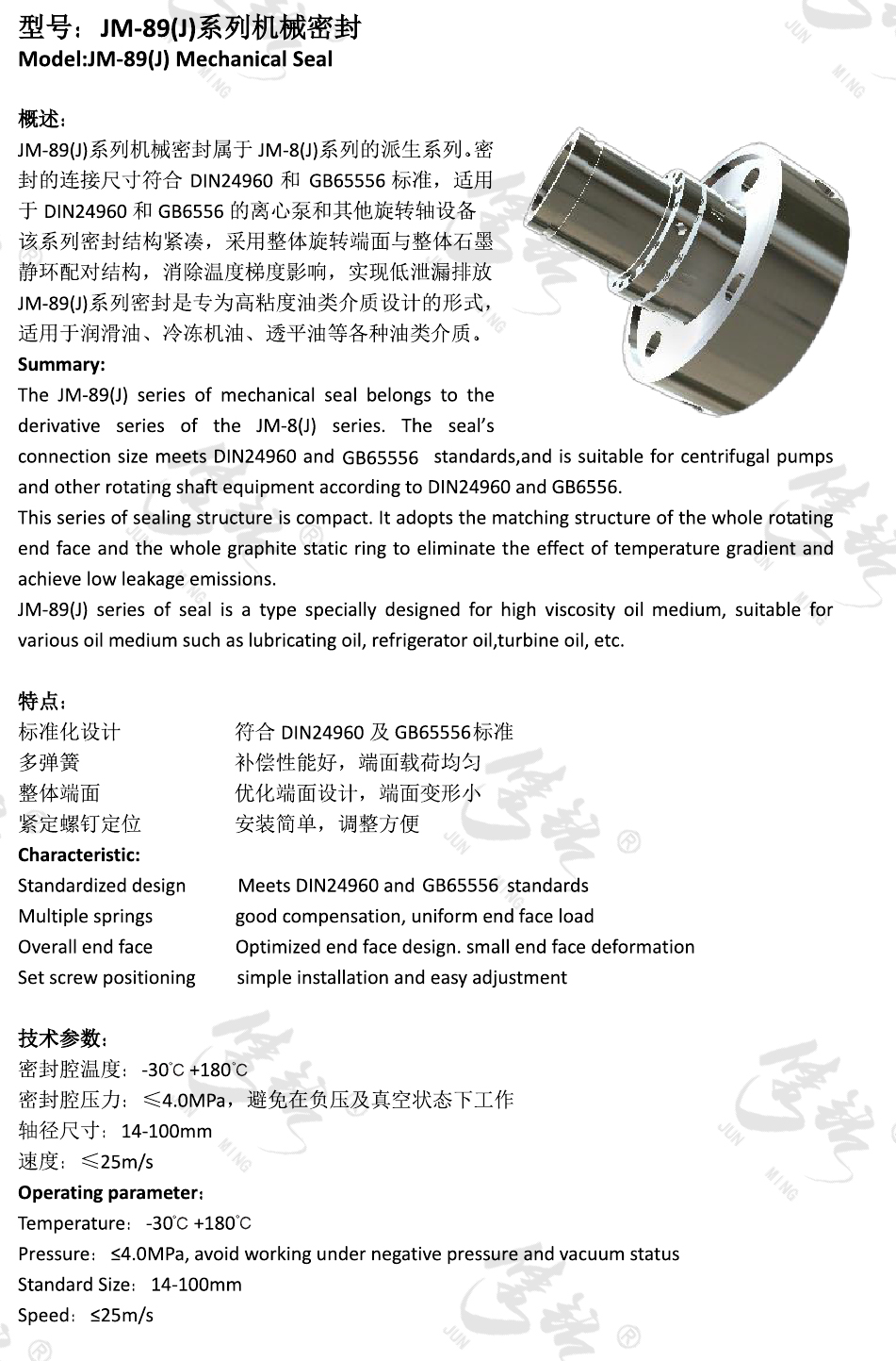 JM-89(J)系列密封是專為高粘度油類介質(zhì)設計的形式,適用于潤滑油、冷凍機油、透平油等各種油類介質(zhì)。