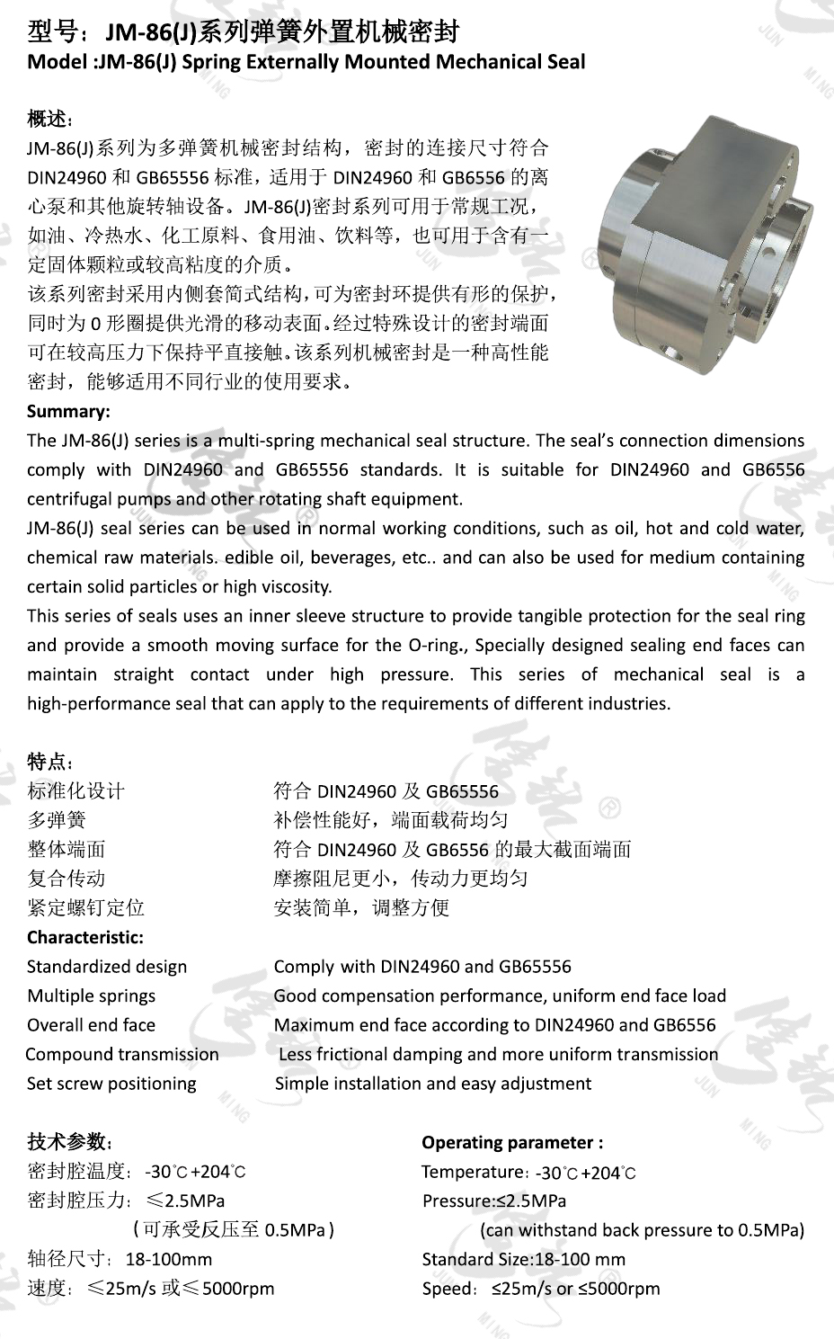 JM-86(J)系列為多彈簧機(jī)械密封結(jié)構(gòu),密封的連接尺寸符合DIN24960和GB65556標(biāo)準(zhǔn),適用于DIN24960和GB6556的離心泵和其他旋轉(zhuǎn)軸設(shè)備。JM-86(J)密封系列可用于常規(guī)工況,如油、冷熱水、化工原料、食用油、飲料等,也可用于含有一定固體顆?;蜉^高粘度的介質(zhì)。