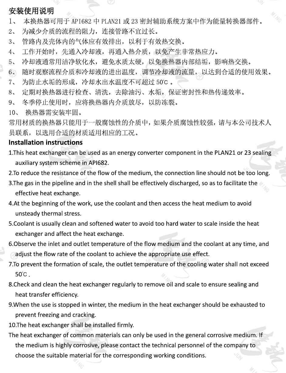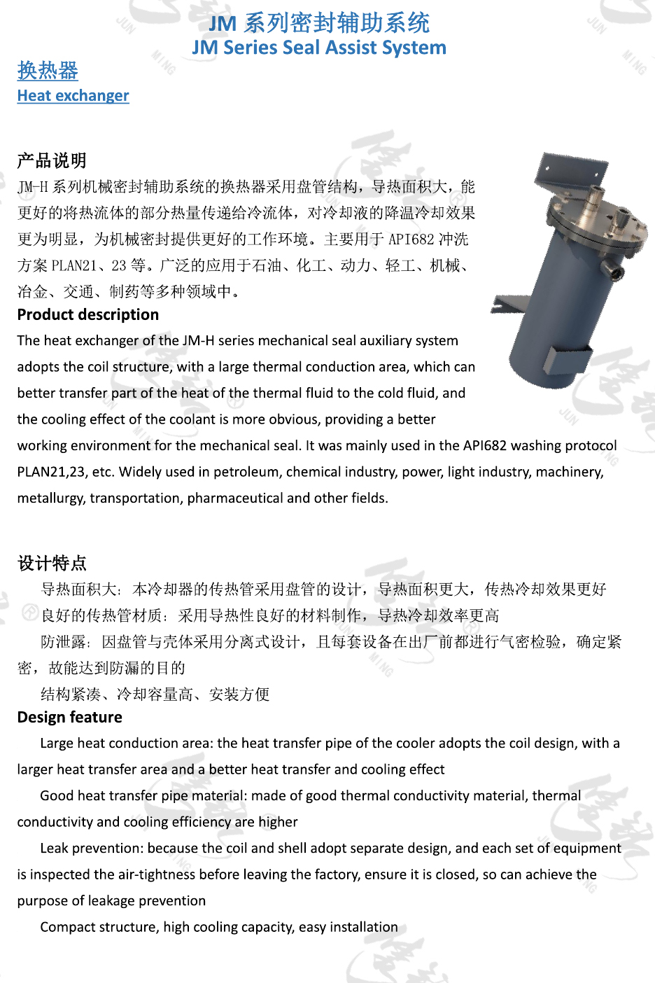 JM-H系列機械密封輔助系統(tǒng)的換熱器采用盤管結構,導熱面積大,能更好的將熱流體的部分熱量傳遞給冷流體,對冷卻液的降溫冷卻效果更為明顯,為機械密封提供更好的工作環(huán)境。主要用于API682沖洗方案PLAN21、23等。廣泛的應用于石油、化工、動力、輕工、機械、冶金、交通、制藥等多種領域中。